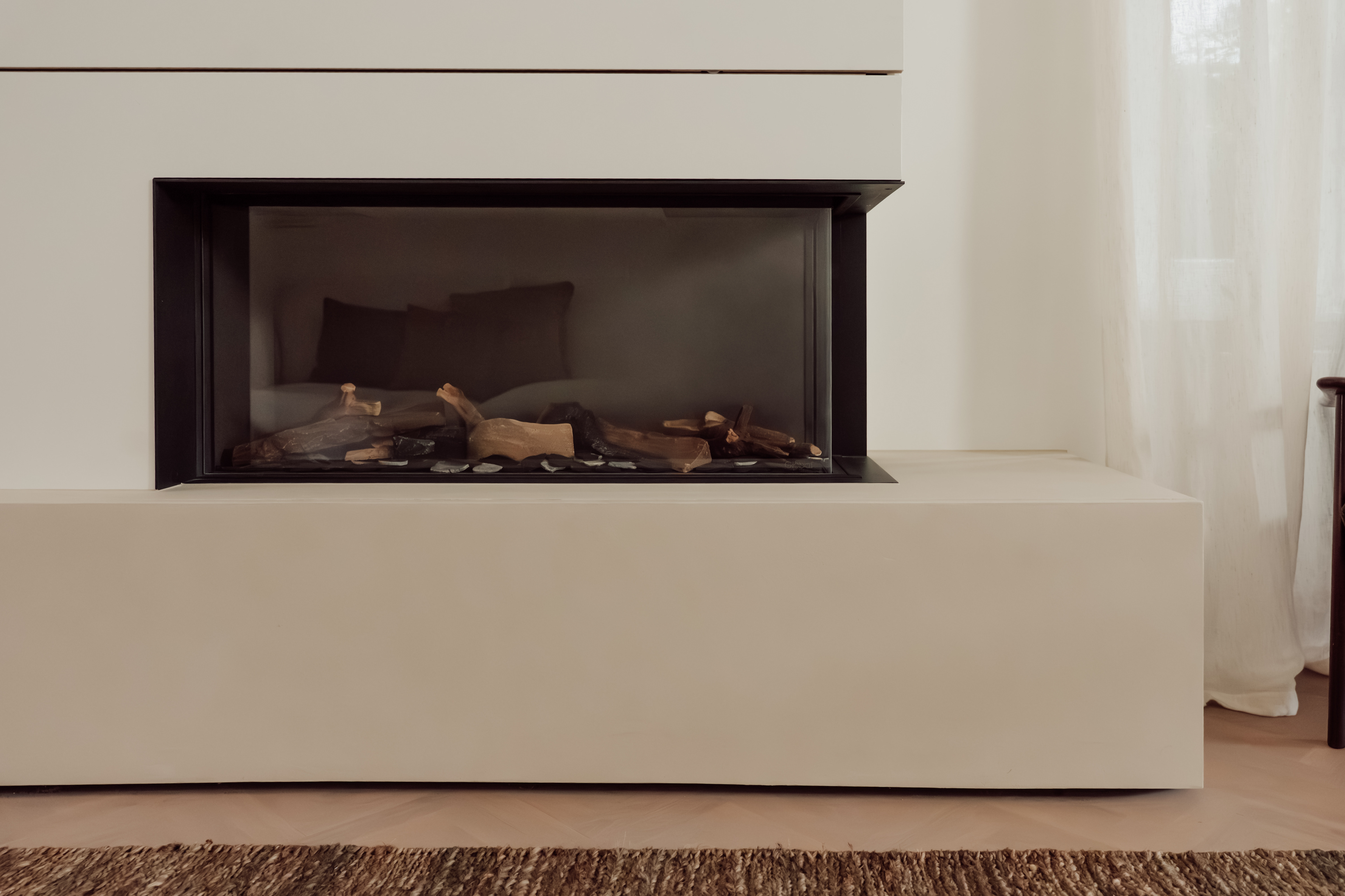 De haard vormt het hart van de leefruimte en werd mee opgenomen in het totaalontwerp.
