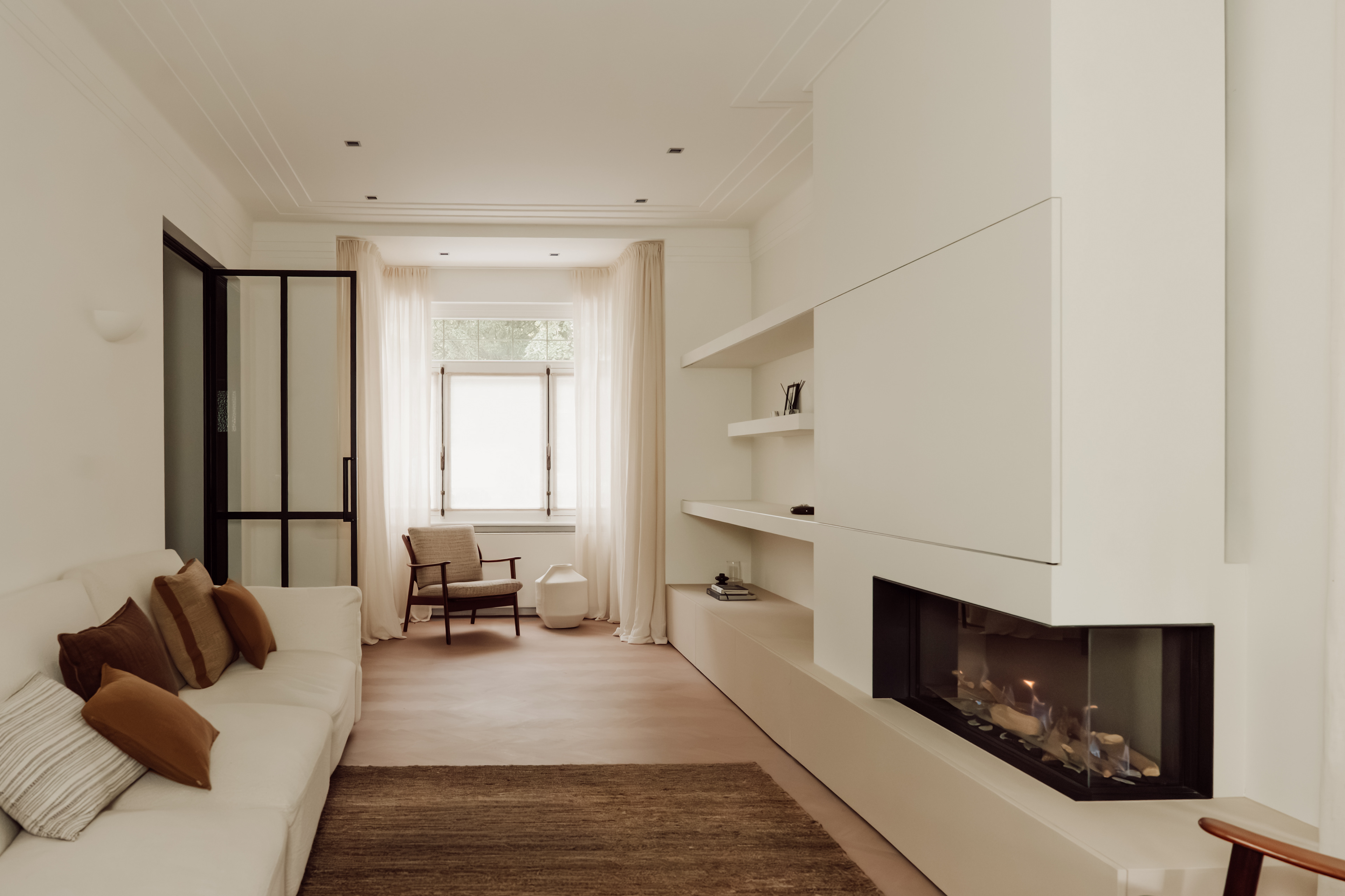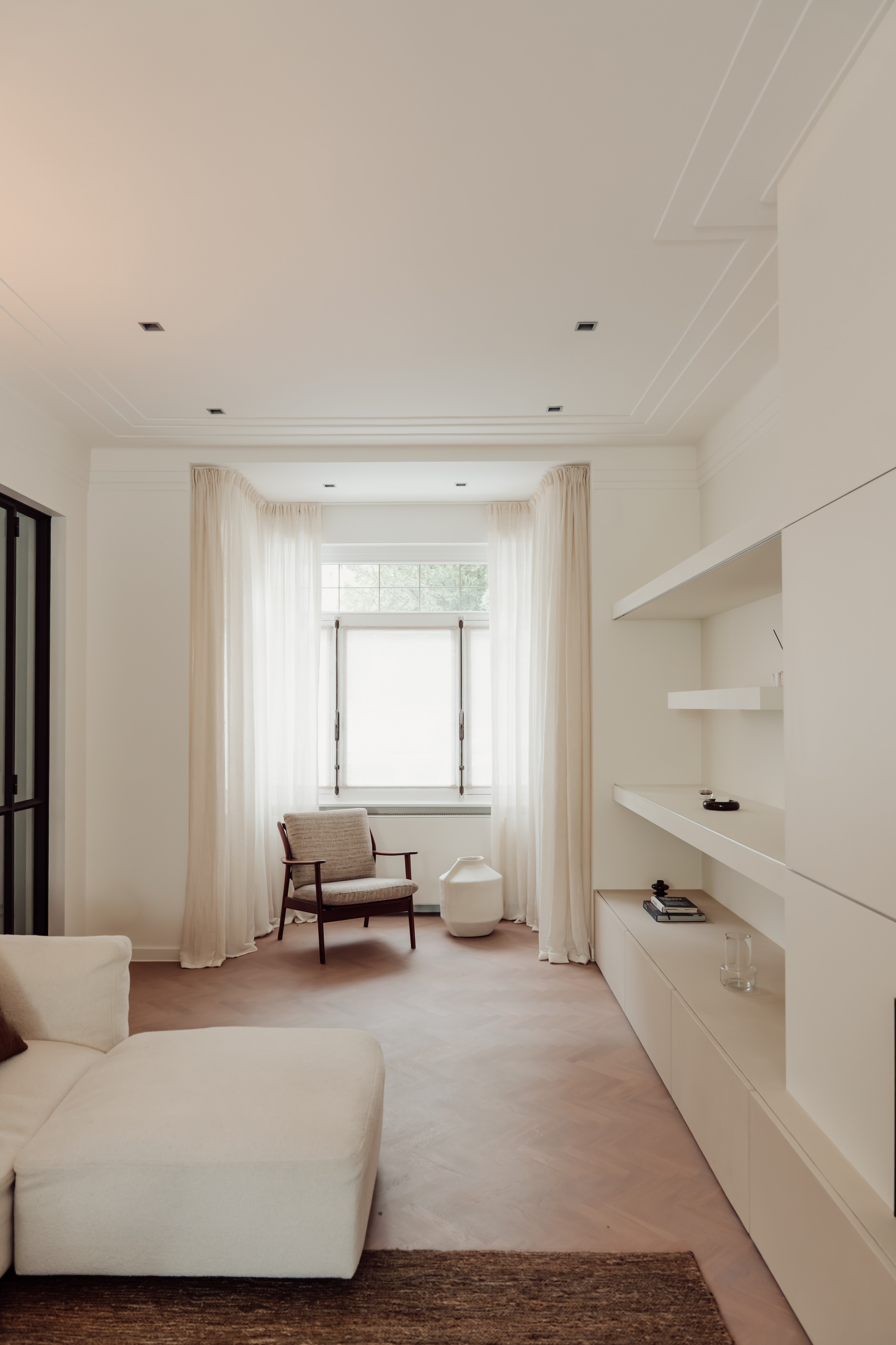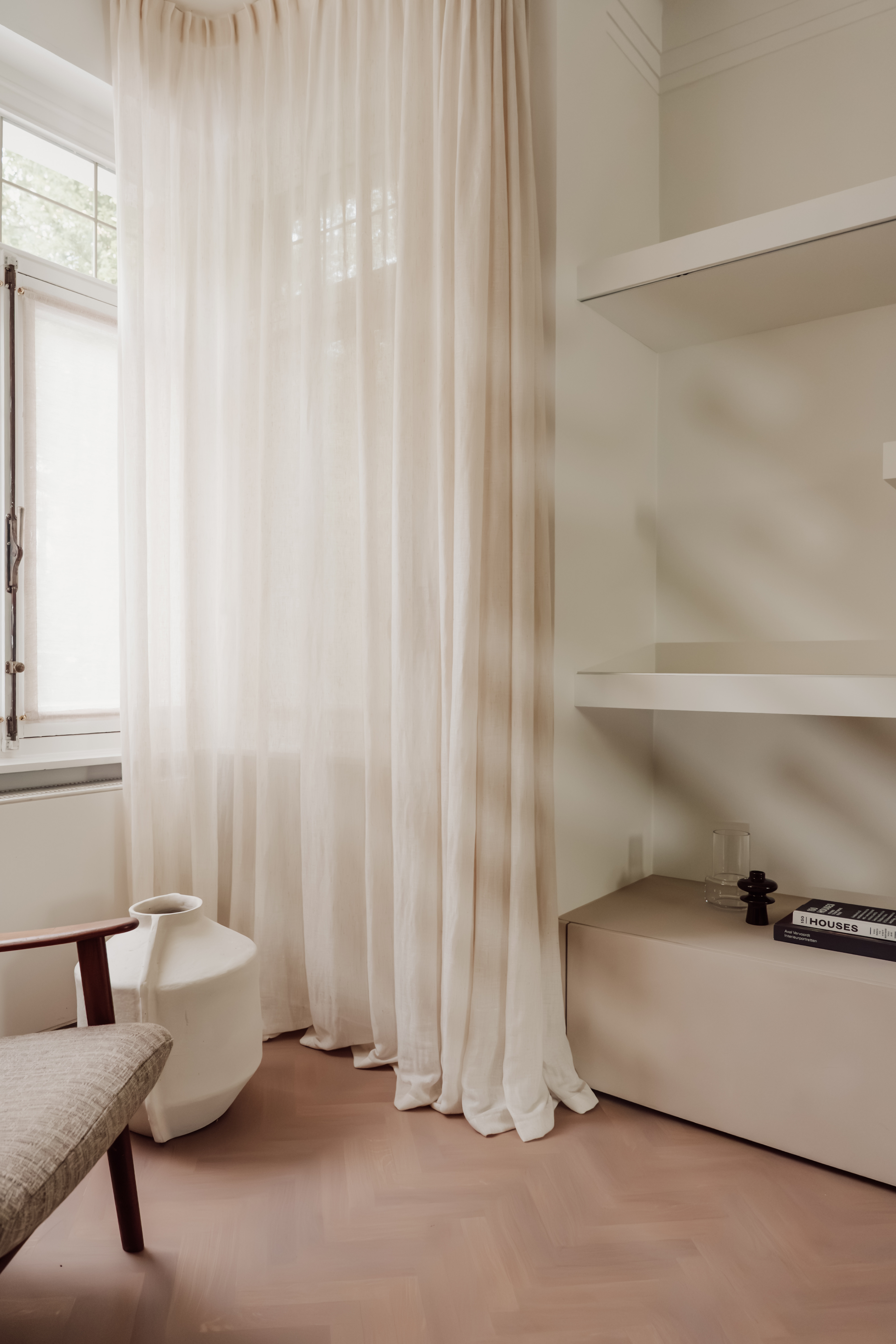 Het maatwerk rondom zorgt voor een harmonieuze eenheid in vorm en materiaal, terwijl de zorgvuldig gekozen stoffen en gordijnen extra zachtheid en warmte brengen.